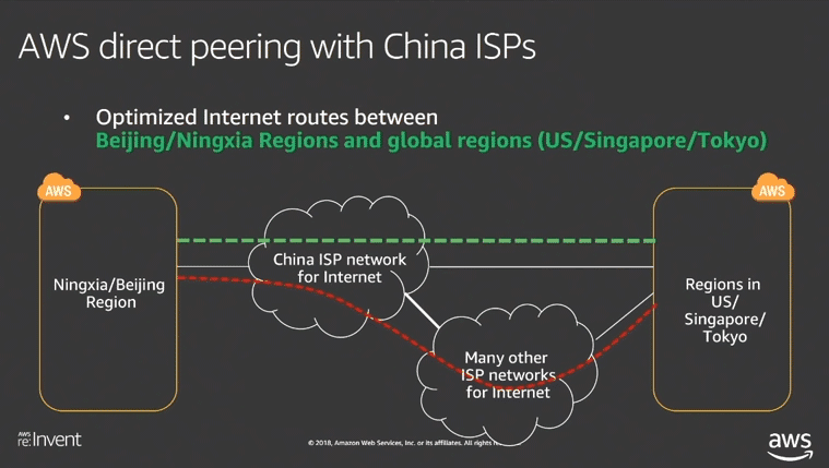 Wenn die Server außerhalb von China konfiguriert und gemanaged werden, verlangsamt die GFW auch hier die Arbeitsprozesse beim Setup, Management und Deployment. Bereits der Login in die AWS Konsole kann länger als in anderen Regionen dauern. Aus diesem Grund ermöglicht AWS das Direct Peering von den AWS Regionen in den USA, Singapore und Tokyo zu den China Regionen. Auf diese Weise können lange Ladezeiten beim Setup und Management verhindert werden.