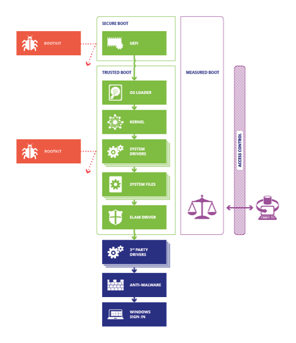 Secure Boot wurde erstmals mit Windows 8 als Schutzmaßnahme gegen die aufkommende Bedrohung durch Pre-Boot-Malware, auch als Bootkits bekannt, eingeführt. Heute ist es ein zentraler Bestandteil der Trusted-Boot-Sicherheitsarchitektur von Microsoft. Während der Initialisierung der Plattform authentifiziert Secure Boot verschiedene Module durch Überprüfung ihrer digitalen Signaturen. Dazu gehören UEFI-Firmwaretreiber, Bootloader, Anwendungen und Options-ROMs.